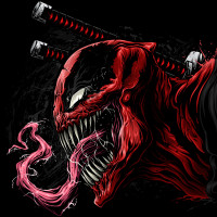 a muscular build. The character is also shown with a cackling expression and his tongue sticking out, which are iconic features of his appearance. The background has a dark, gritty texture that complements