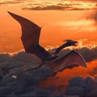 The image depicts a fantasy scene with a dragon flying in the sky against a dramatic backdrop of clouds and an orange or red hued sky, which could be interpreted as either sunrise or sunset. The presence of the dragon suggests this is from a fictional world, commonly found in fantasy genres where mythical creatures such as dragons exist.