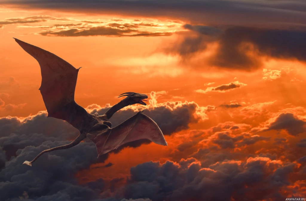На картинке изображена сцена фэнтези с драконом, летящим в небе на драматическом фоне облаков и оранжевого или красного оттенка неба, который можно интерпретировать как восход или закат солнца. Присутствие дракона предполагает, что это из вымышленного мира, обычно встречающегося в жанрах фэнтези, где существуют мифические существа, такие как драконы.