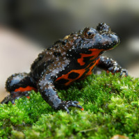 На снимке изображена маленькая лягушка. У нее красные отметины на теле, и кажется, что она отдыхает на покрытой мхом поверхности, которая, вероятно, является землей в естественной среде обитания.