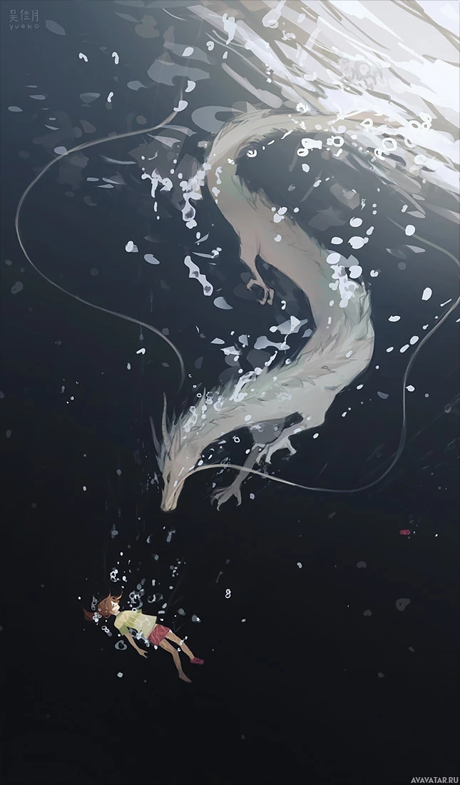 На картинке изображена подводная сцена, где молодая девушка взаимодействует с драконом. Дракон, кажется, либо плавает, либо летит близко к поверхности воды, и он имеет змеиную форму, которая характерна для традиционных драконов в фантастических историях. Картина передает чувство удивления и неожиданной встречи между человеком и мифическим существом.