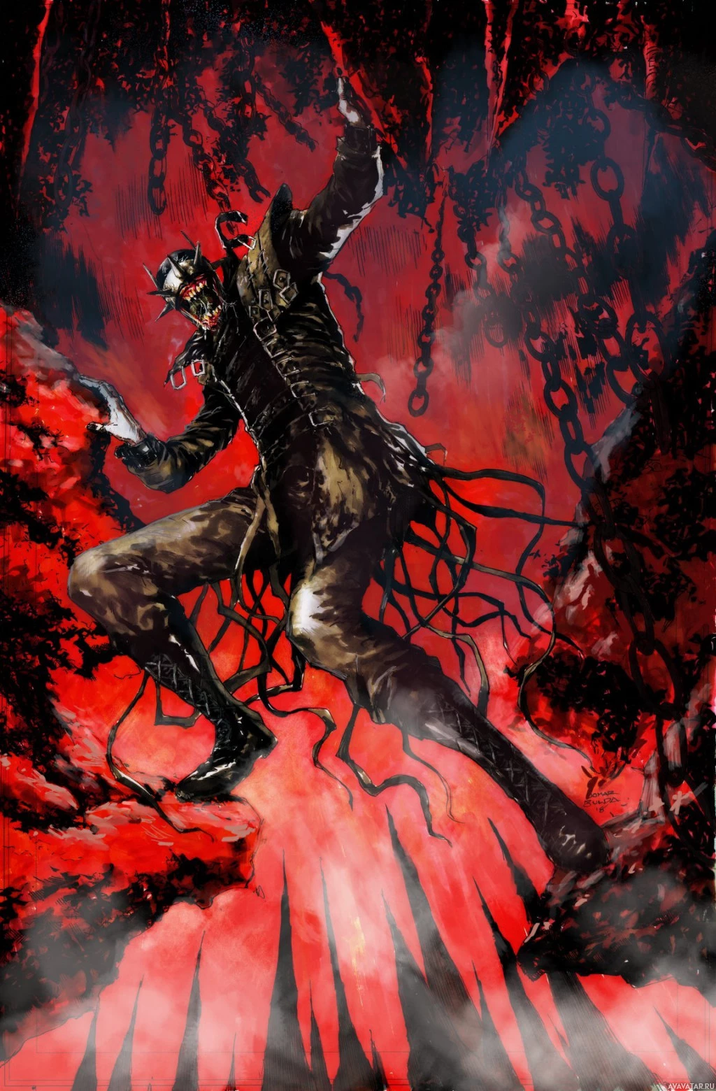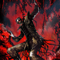 tattered clothing with bloodstains. Their face is obscured by shadow or darkness, adding to