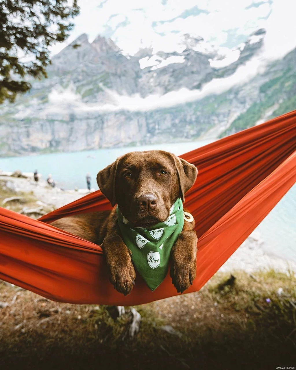 a red hammock with its head out and ears perked up. The backdrop of the scene is a beautiful mountain landscape with clear blue skies, suggesting a peaceful