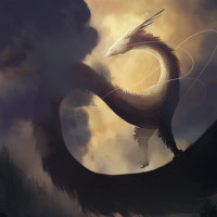 a fantastical scene featuring what appears to be a dragon. The dragon is shown with a serpentine body,