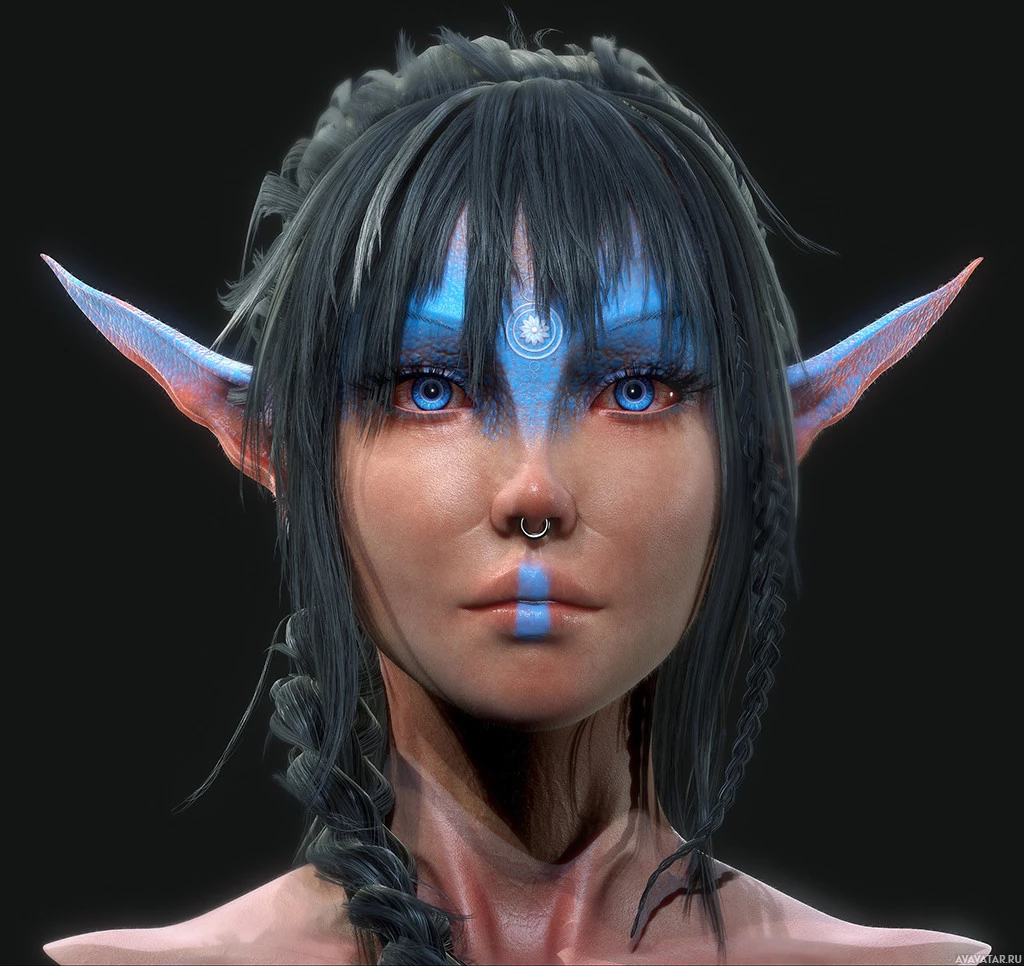 Картинка показывает 3D-рендеринг персонажа эльфа. У нее заостренные уши, голубые глаза со звездоподобной отметиной на левой брови, и она украшена татуировкой или отметиной на правой щеке. Ее волосы уложены косами, которые, кажется, напоминают лозы или растительный материал. Персонаж имеет серьезное выражение на лице и обращен непосредственно к зрителю.