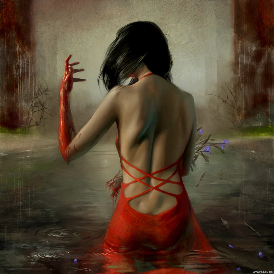 brown hair, and is wearing a red dress or garment that might suggest a thematic link to blood, possibly indicating wounds or an artistic choice to symbolize something else. She has her head turned away from the viewer, looking towards her left side, which gives