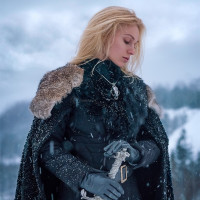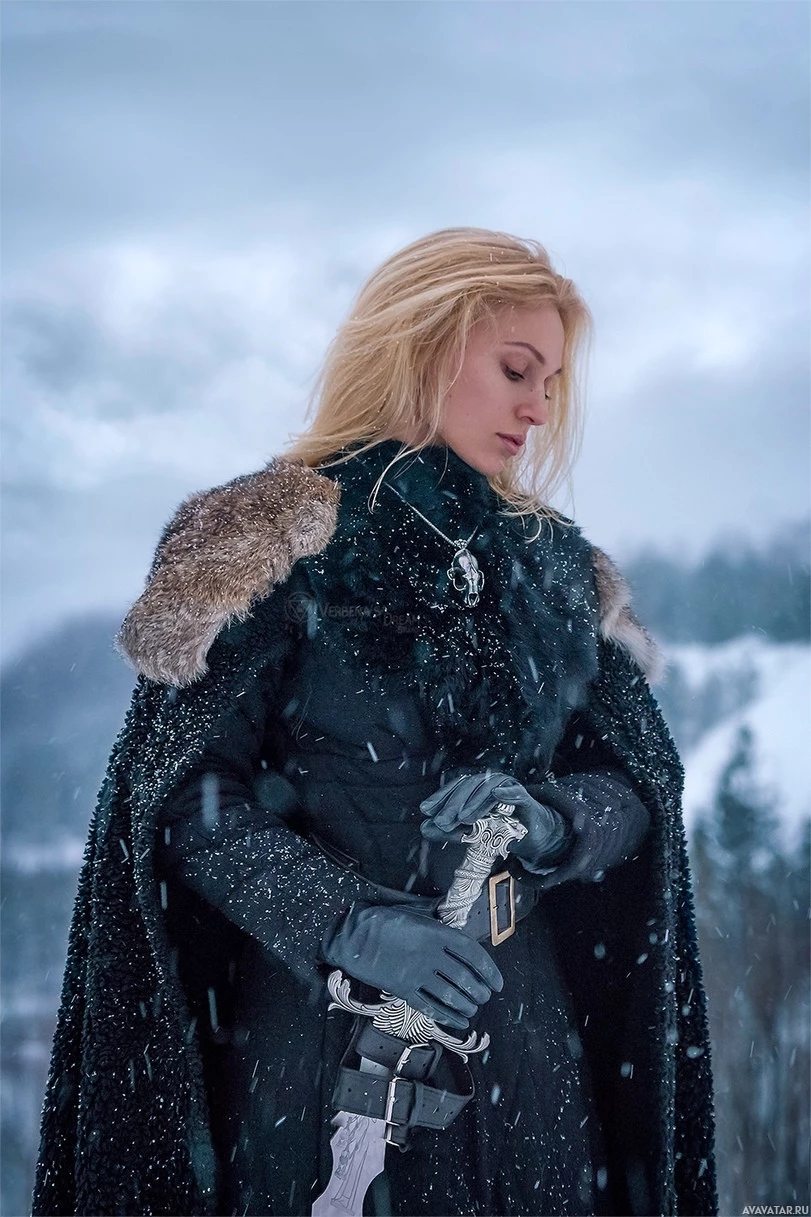 blonde hair and is holding a sword, suggesting they may be portraying a character from a historical or fictional setting. They are standing in