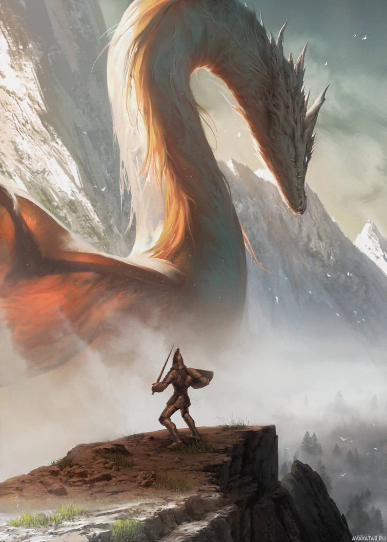 a lone figure who seems to be a warrior, standing atop another rock formation and facing the dragon. The warrior is holding what could be a shield or a paraphrase in