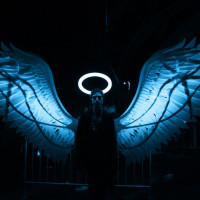a sense of motion conveyed by the streaks of light on the wings, which could be due to movement or a time-lapse effect during the photography. The image is rich in symbolism and might have been captured at an event with a spiritual, fantasy, or artistic theme.