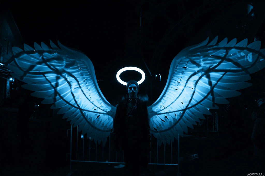 angelic display that appears to be composed of feather-like structures. The angel is wearing a halo above its head and has spread wings that are colored blue with highlights suggesting