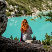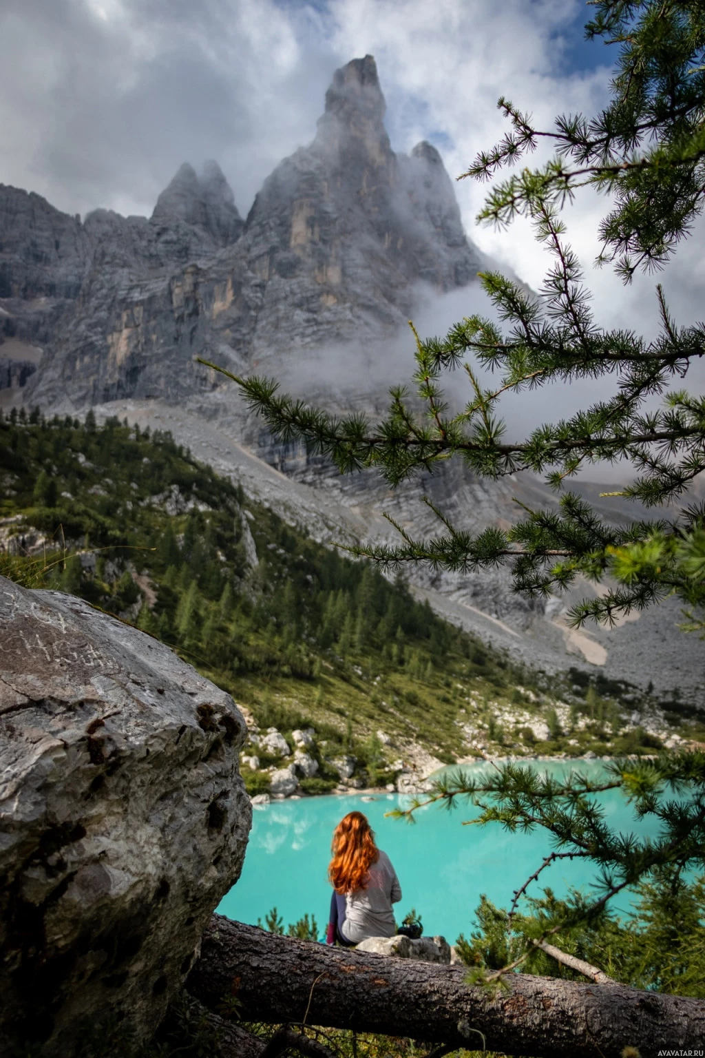 The picture shows a person, specifically a red-haired girl, seated on rocks. She appears to be looking at a beautiful