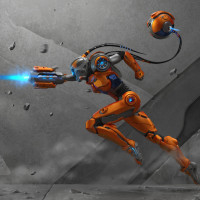 robot in motion. The robot appears to be running, with one arm extended forward as if it's reaching for something or using a tool. It has