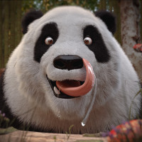 The image features a character that appears to be an animated panda. The panda is depicted with a surprised or playful expression, its tongue sticking out as if it's tasting something sweet. It's set against a natural background, which suggests the scene could be from an animated film or game.