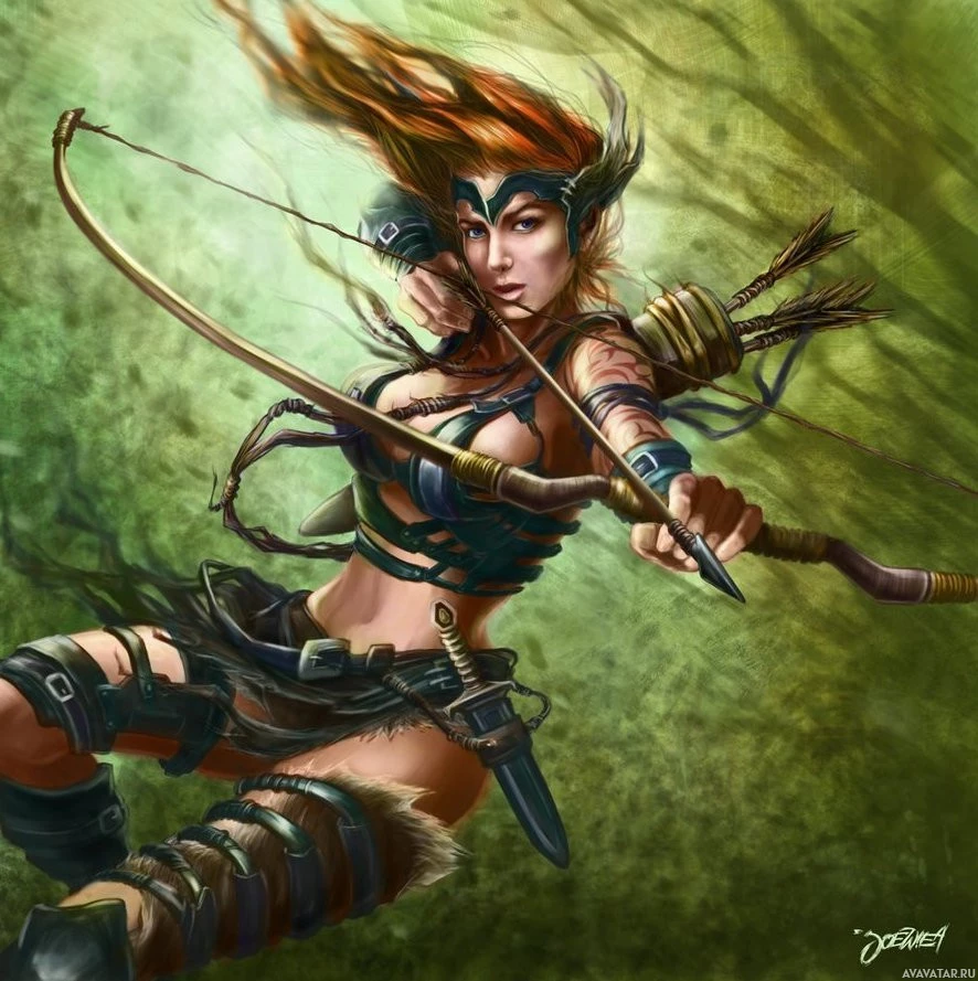 На картинке изображен женский персонаж с яркими рыжими волосами, одетый в наряд, который предлагает тему фэнтези или приключения. Она держит лук и, кажется, находится в разгаре стрельбы по чему-то, возможно, во время боя или охоты. Фон испускает туманную атмосферу, которая добавляет фантастическую атмосферу сцены.
