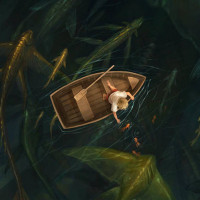 a small boat amidst what appears to be a sea teeming with fish. Additionally, there are large