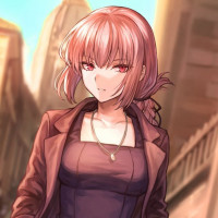 На картинке изображен персонаж с розовыми волосами, одетый в черное пальто над платьем и шортами, стоящий в городской обстановке, которая кажется узкой улицей. Она также носит каблуки и носит сумочку.