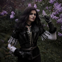 In this picture, there is a person cosplaying as Yennefer from "The Witcher" game. The individual is wearing a costume that resembles the attire of