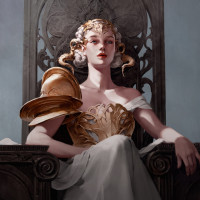 golden armor, suggesting that she might be a queen or a warrior. Her expression is contemplative as she gazes off to the side, creating