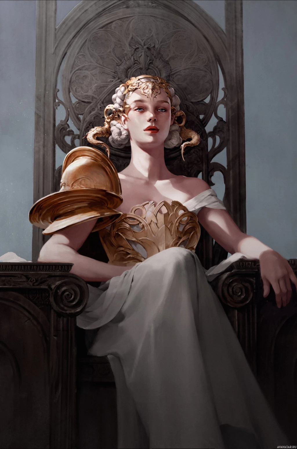 a female character seated on a throne. She is adorned with a crown and