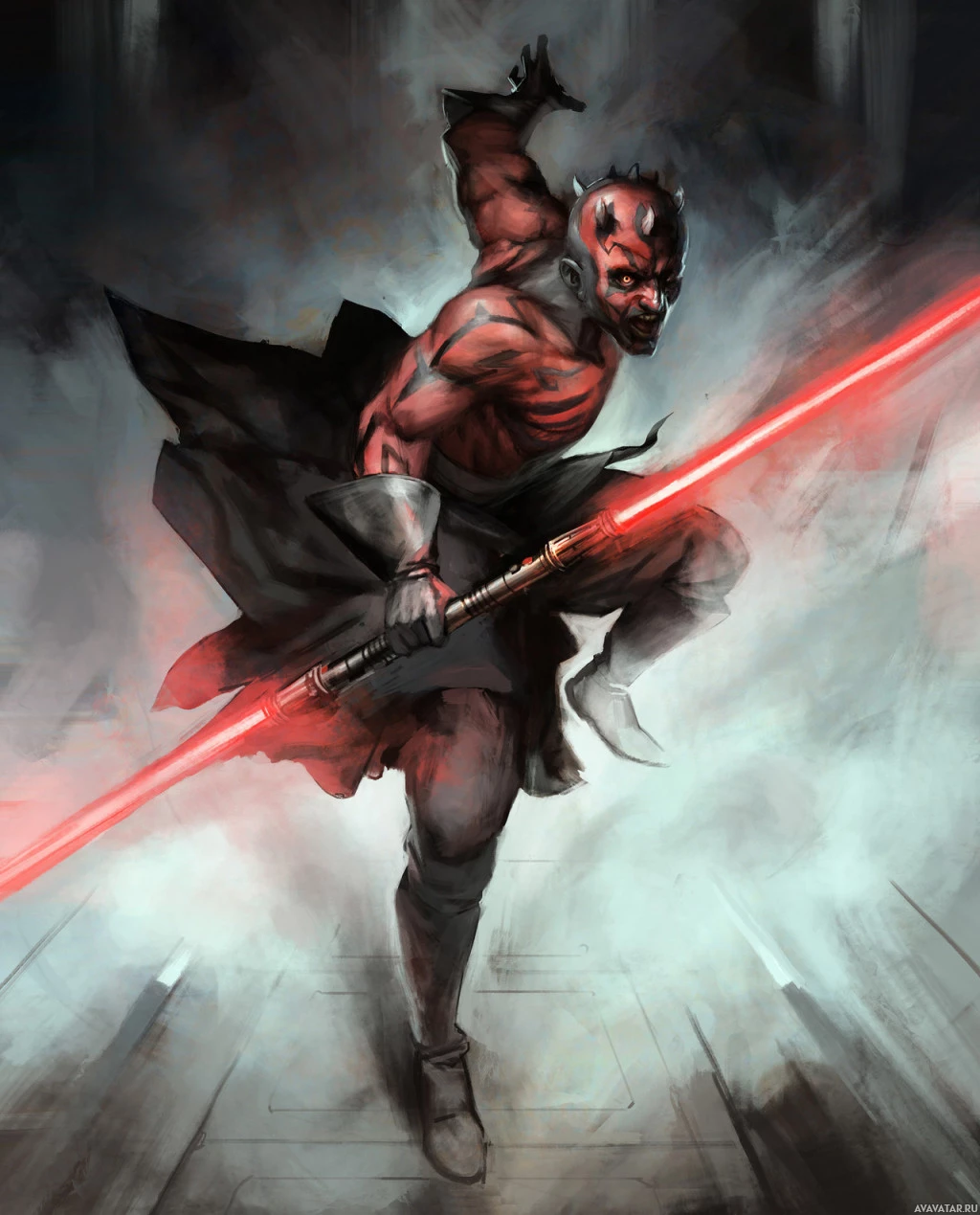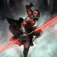 the Star Wars franchise. This character is depicted with distinctive features, including red and black skin, pointed ears, and