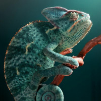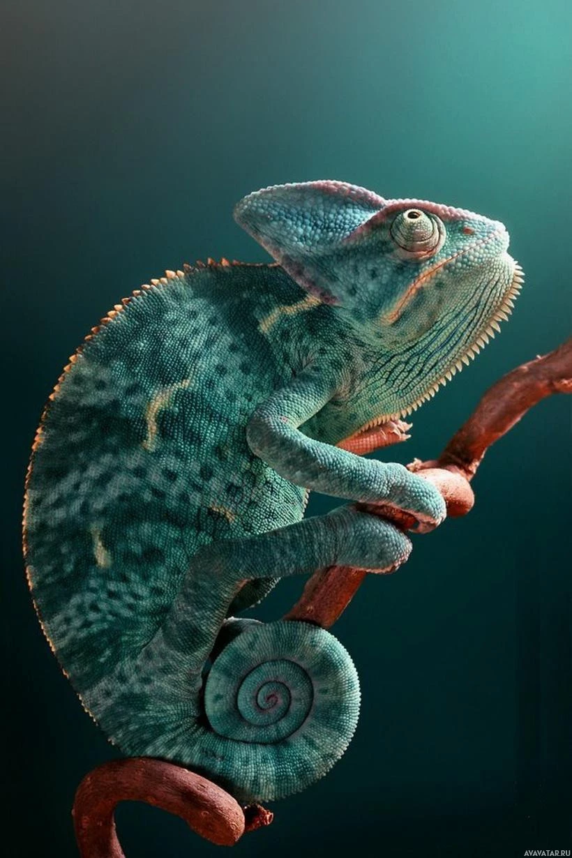 На картинке изображен хамелеон, животное, известное своей отличительной способностью менять цвета. Похоже, что он расположен на ветке дерева и демонстрирует типичную окраску хамелеона с яркими оттенками.