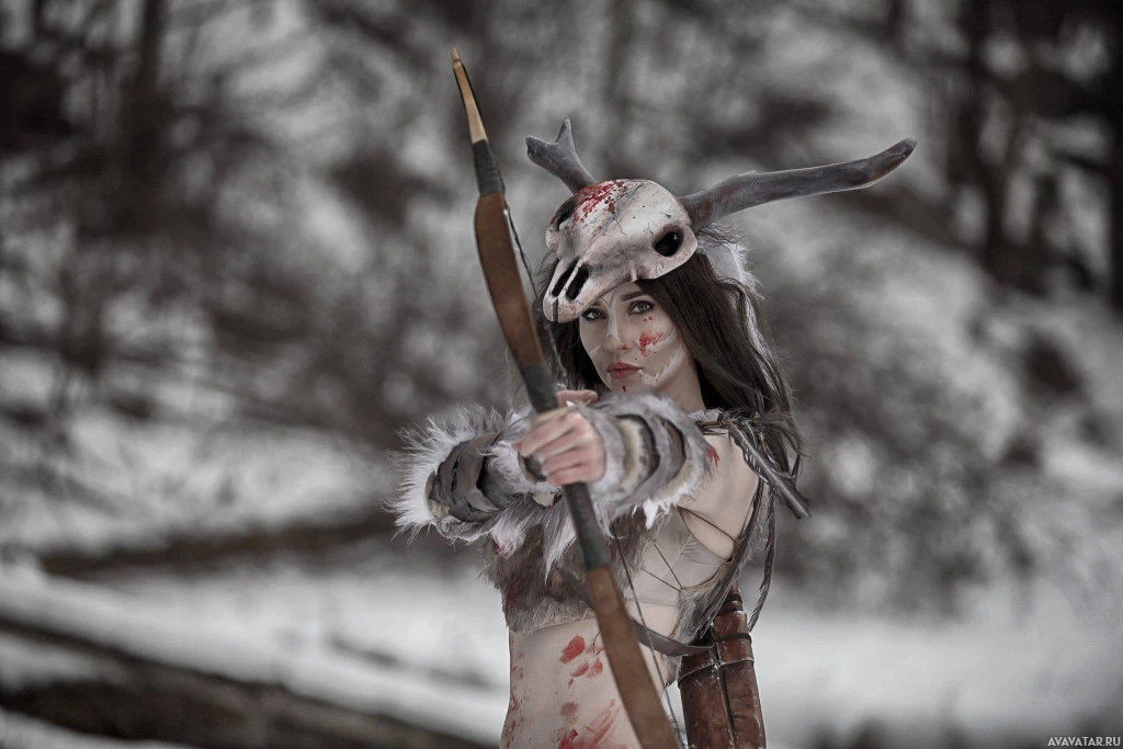 a bow in hand, seemingly poised for archery. She is dressed in what appears to be Native American attire, including feathers and possibly war paint or