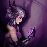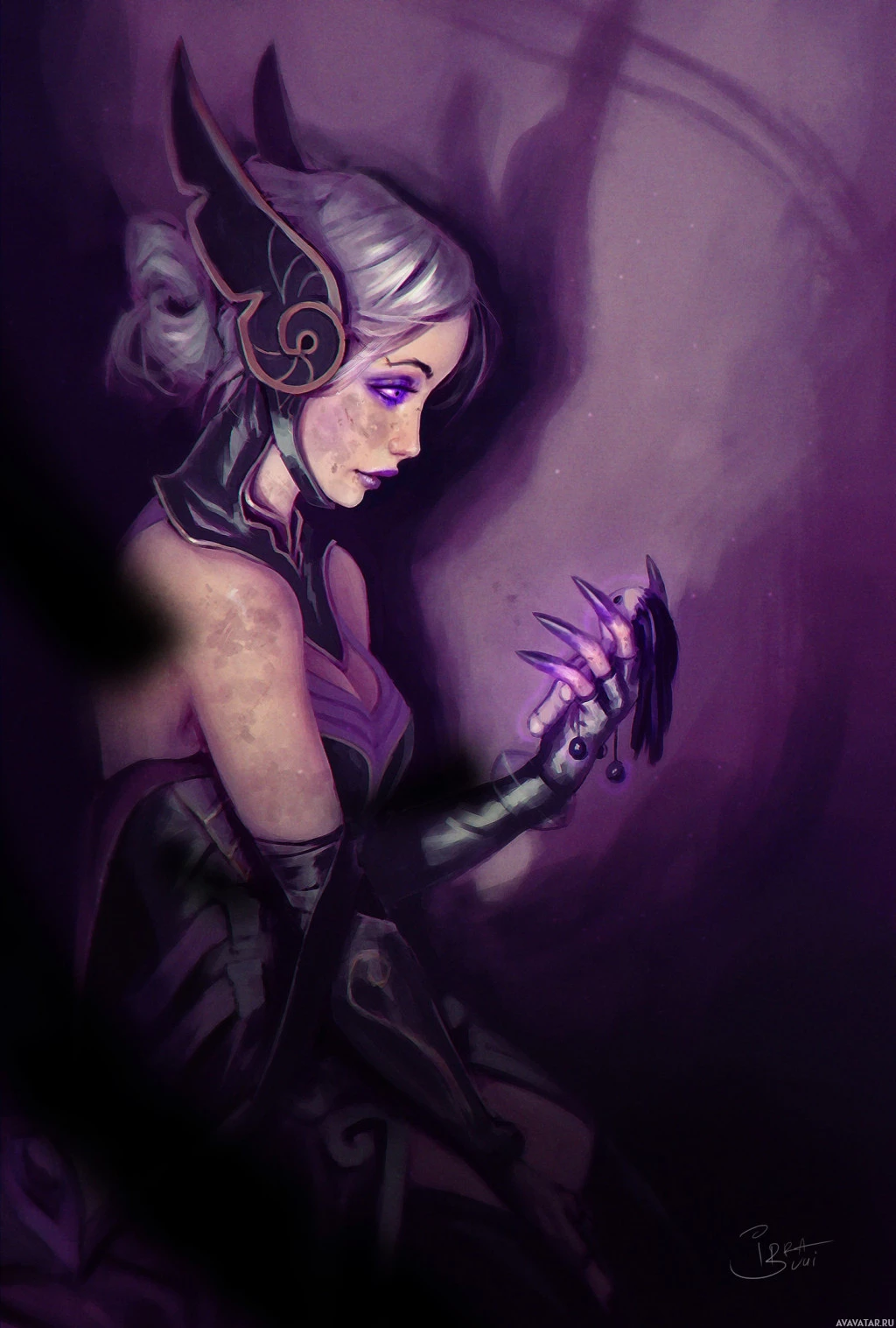a small object in her hand, possibly a magical item or a key of some sort. The overall tone of the artwork is dark and moody, with purple and black tones dominating the color scheme, which adds to the mystique and otherworldly