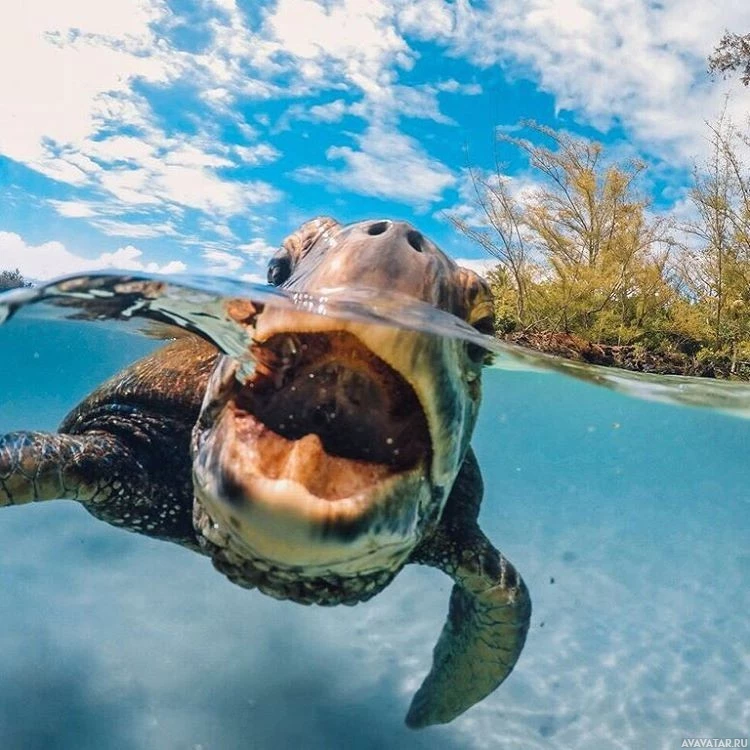 blue water. The turtle appears to be making an "O" shape with its mouth, which might indicate that it's yawning or feeding. There are also some