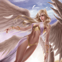 a fantasy character that resembles an angel. She has wings and is depicted in a pose that suggests she is either flying or floating, with one wing raised as if caught mid-flight. Her attire includes elements of armor, such as breastplates and gauntlets, which gives her a warrior-like appearance. The character has