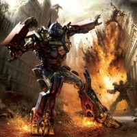 an intense scene with a robot, which appears to be Optimus Prime from the Transformers franchise, amidst an explosion in a city setting that looks like it could be inspired by a historical or futuristic location. The robot is in