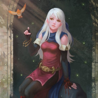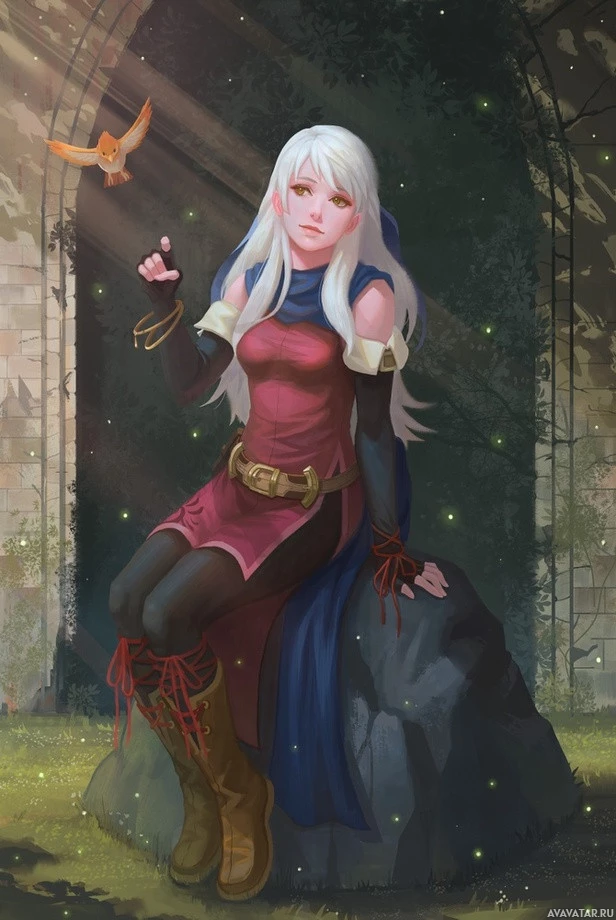 puffy sleeves, a skirt, and boots. The character also has a bird perched on her hand, which she is gently holding. The setting seems to be an outdoor location with ancient ruins in the background, and there are lights or fireflies visible near the ground, creating