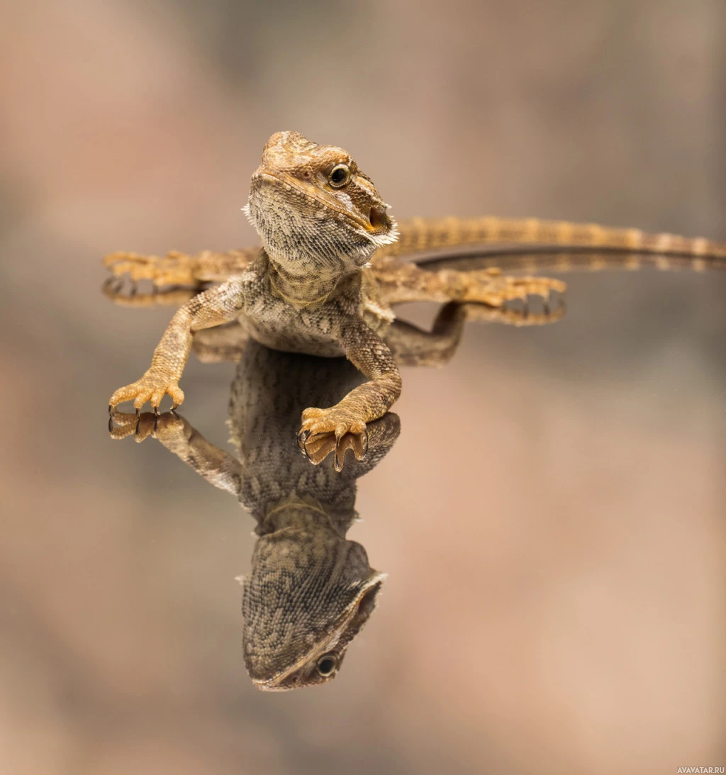 На картинке изображена ящерица, вероятно, вид геккона или аналогичный тип рептилии. Кажется, что она находится на поверхности, которая может быть водой, учитывая отражение под ней. Ящерица имеет узорчатую кожу с чешуей и смотрит прямо в камеру.