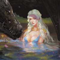 a blue dress and has long, silver hair. She is sitting in water that appears to be shallow, and her expression suggests she may be in danger or confronting a challenge. A