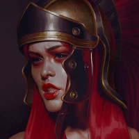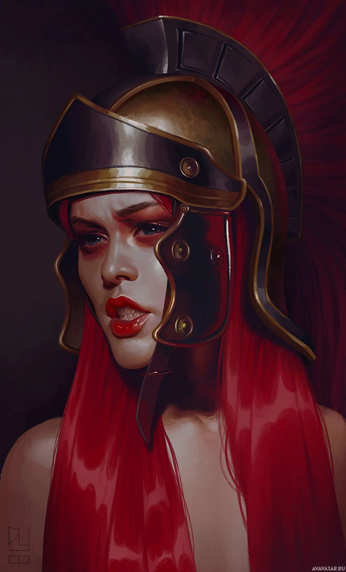 red hair, wearing warrior-like attire including a golden helmet and what appears to be armor. This character has a confident expression and is set against