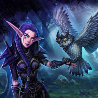 game environment, possibly inspired by the Warcraft series due to the drow (elf) appearance of the character and the presence of a fantastical bird like the owl.