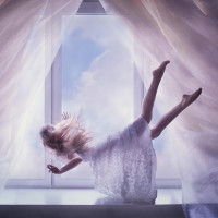 a young girl in mid-air, seemingly falling from an open window. Her arms and legs are spread out, suggesting she might be in the midst of a playful or accidental fall. There is a soft and ethereal quality to the photograph due to the lighting and the gauzy curtains around her, which creates