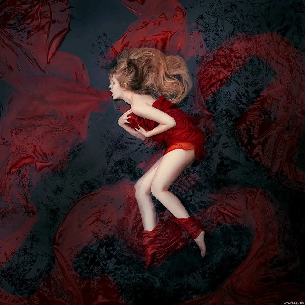 red dress, which matches the color of the surrounding water. Her posture suggests movement through the water, with one arm extended forward as if she were swimming or running in it. The image is artistic and may symbolize various themes, such as freedom, passion, or