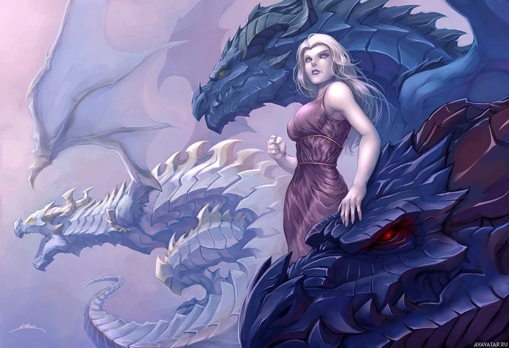 vibrant colors and detailed artwork, highlighting the fantastical elements and the dynamic interaction between the woman and the dragons.