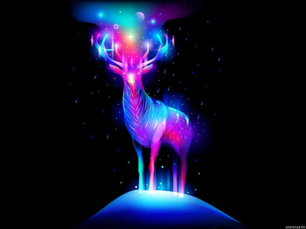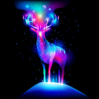 vibrant colors and shades that suggest a fantastical or whimsical theme. There are also sparkles and particles around the deer, which add to