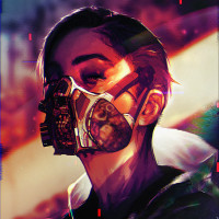 a respirator mask. The individual is depicted with a contemplative or serious expression, looking downwards. They are also wearing what appears to be