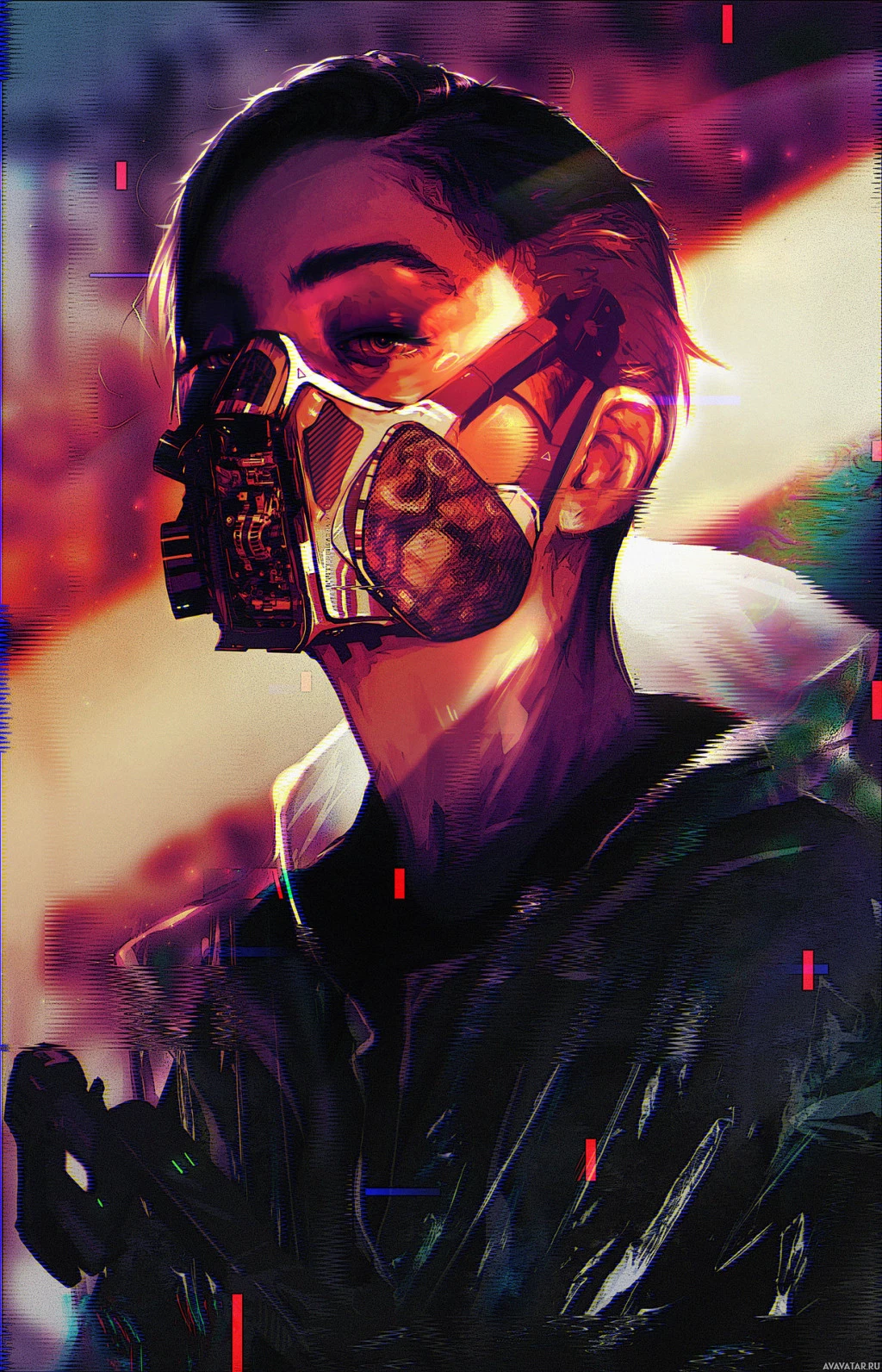 warm tones and neon accents that give it an intense and dramatic feel.
