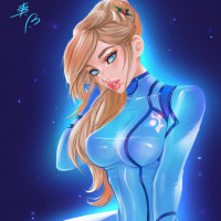 a female character, which is known to be Samus Aran from the Metroid video game series. She's depicted in her