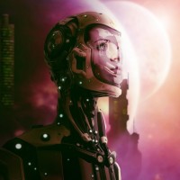 science fiction themes, suggesting advanced technology and artificial intelligence. The color palette is dominated by blues and purples with warm lighting accents that give the scene a moody and dramatic atmosphere.