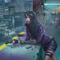 electronic device on her chest. There are also what seem to be small drones flying around her, adding to the science fiction theme. Additionally, there is a gun resting next to her on the railing, which could imply she's in a situation where she needs protection or has just finished dealing with some form of threat. The overall style of the artwork is detailed and illustrative, with vibrant colors that give it an energetic atmosphere.