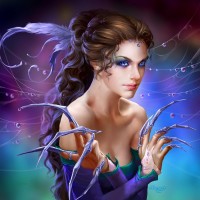 intricate patterns on the sleeves and torso, and she has elongated nails that resemble claws. Above her head are delicate strands of light or energy, giving a whimsical or ethereal effect to the image. The background is rich in colors, transitioning from purple to green, which complements the fantasy theme of the artwork.