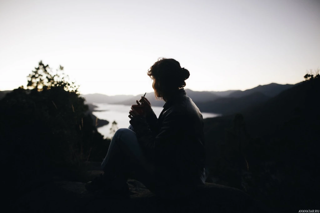 The image depicts a person sitting on a rocky outcrop at what appears to be either dawn or dusk, given