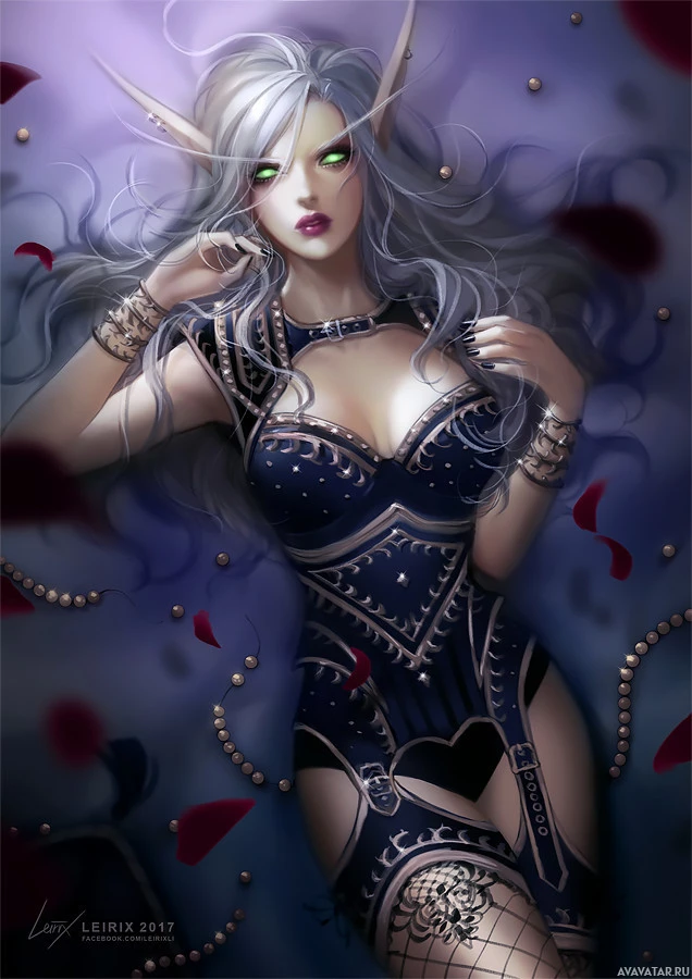 white hair. She is depicted in an alluring and seductive manner, wearing a black, detailed outfit with hints of gothic or Victorian influence, including elements like corsets and jewelry. Her pose suggests