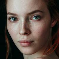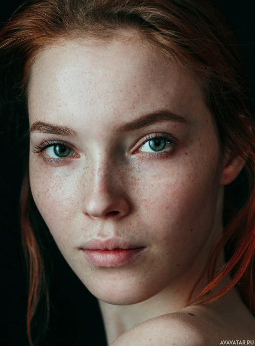 red hair that stands out against her natural complexion, which includes some noticeable freckles across her face and shoulders. Her eyes have