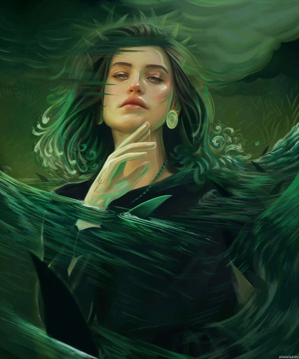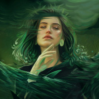 shades of green and black that might represent water or waves, suggesting that she could be depicted as a mermaid-like figure. The overall atmosphere is one of