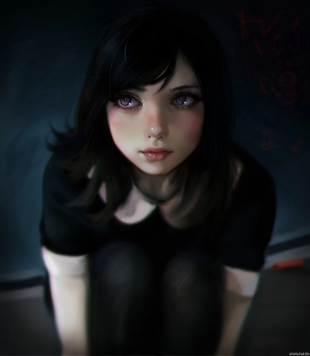 a black top with what appears to be a ruffled collar, and her posture is slightly hunched over as she sits on the floor with one hand resting near her knee. Her expression is neutral, and there's
